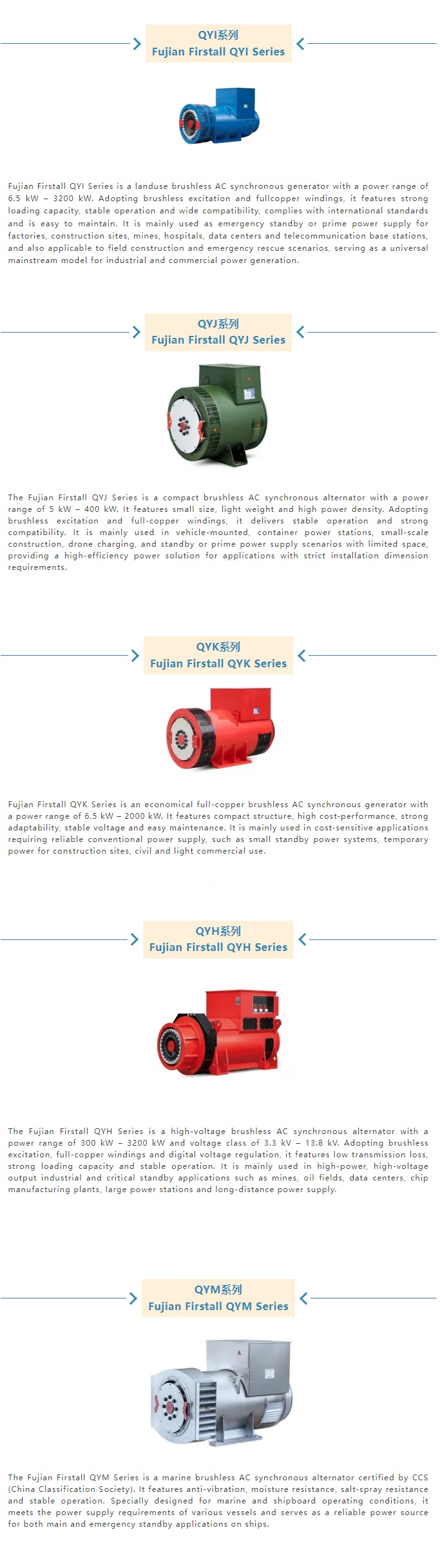 The company has built a "twin-star at the same level" development pattern: FIRSTALL Power (Tiehu Base, 20000㎡, focuses on the R&D and production of conventional low-voltage and various special alternators, with a designed annual output of 100,000 units) and FIRSTALL Electric (Minhou Base, focuses on core high-voltage and ≥3.3kV high-power alternators, with a designed annual output of 2,000 units), They share technical genes but focus on different fields without overlap. FIRSTALL Electric mainly focuses on QYH series (3300V~16500V) and QYI high-power series (2500KVA+); as the cornerstone in the conventional and special fields, FIRSTALL have been exported to 45 countries and regions worldwide. We specialize in the QYI Series, QYK Series, QYM Marine Series, as well as customized special purpose products, widely applied in emergency vehicle-mounted systems, military equipment, mining machinery, and other specialized applications.