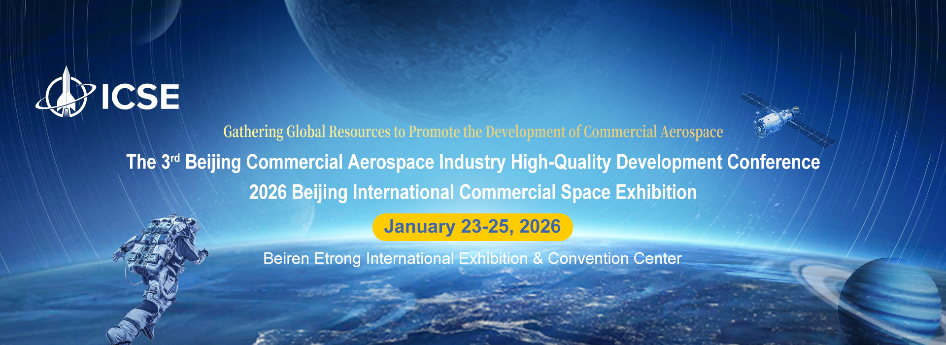 Themed with Pooling Global Resources and Jointly Advancing the Development of Commercial Aerospace, 2026 Beijing International Commercial Space Exhibition (ICSE) will take place on January 23-25, 2026, at E-Town (Yizhuang), Beijing, China.
